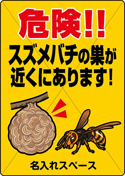 業者に依頼し駆除するのが一番ですが、駆除してもまた近くに巣を作られる場合や、巣の場所は分からないがスズメバチがよく飛んでいる場所、また巣を作られる頻度が高い場所などに予め注意看板を設置しておくことを勧めます。